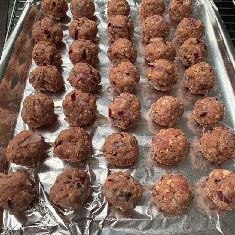 Devide into 20-30 balls, each a bit smaller than a golf ball but biggerthan a marble place on a tin foil lined baking tray and cook for about 25 minutes on 180 degrees centegrade, no need to turn them they will cook through on the oven.