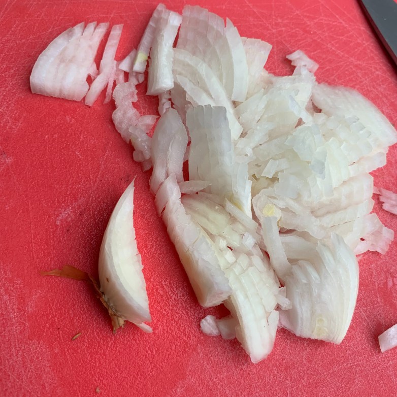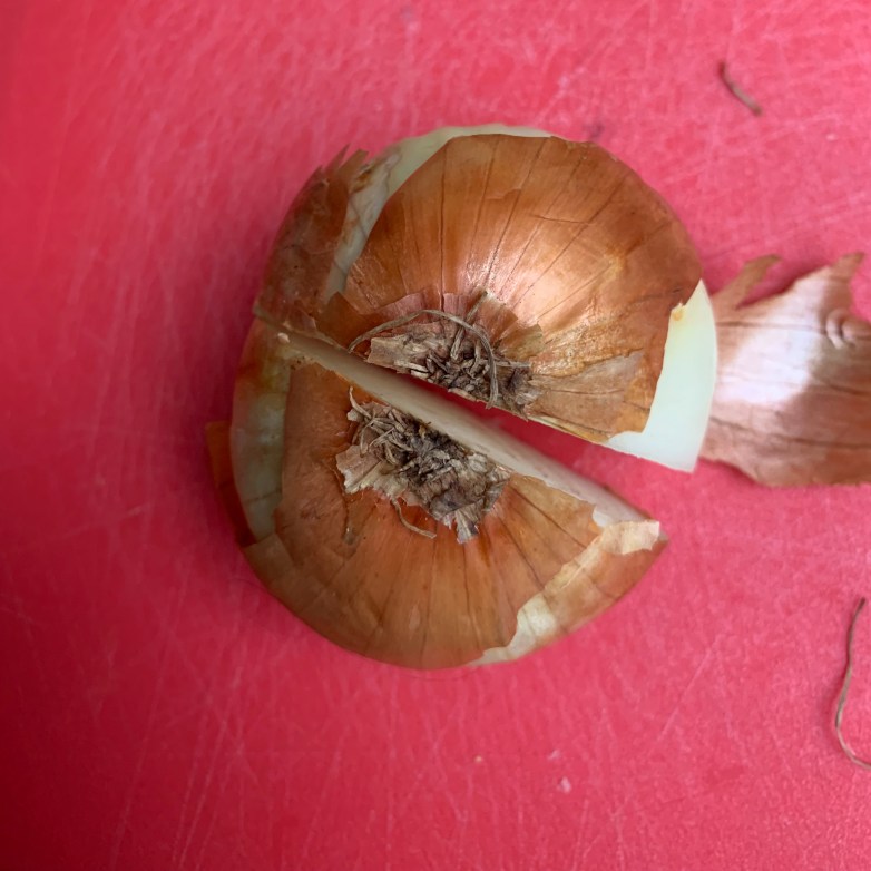 Slice the onion crossways, leaving little tiny pieces of onion. Throw the root way.