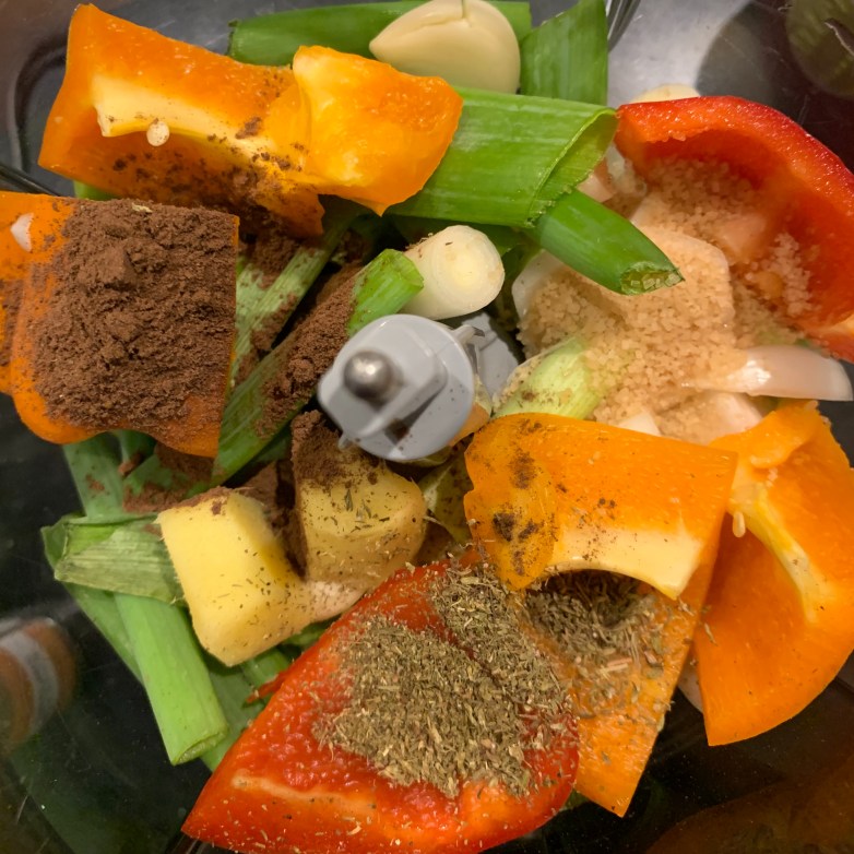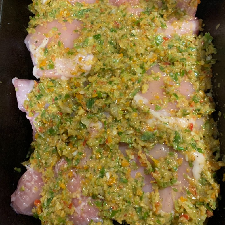 With low histamine the freezer is your friend, so take 8 chicken thighs which are not quite defrosted and smother them with the paste. Your hands will get really cold doing this. arrange the chicken in a roasting tray and leave in the fridge for about an hour while the chicken finishes defrosting.